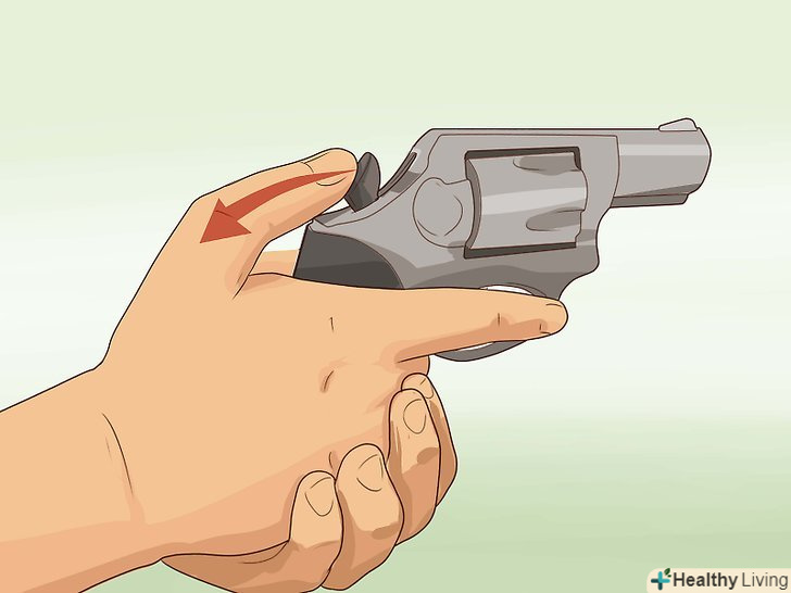 Візьміть револьвер домінуючою рукою за рукоятку. початку берете рукоятку револьвера домінуючою рукою. Необхідно взяти зброю досить високо, щоб ваш великий палець був з іншого боку револьвера. [14]- Чим нижче захоплює ваша рука рукоятку револьвера, тим більше віддача піде вгору, а не назад, що зажадає більше часу для прицілювання при наступному пострілі. [15]