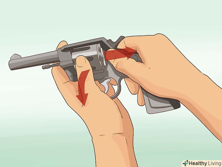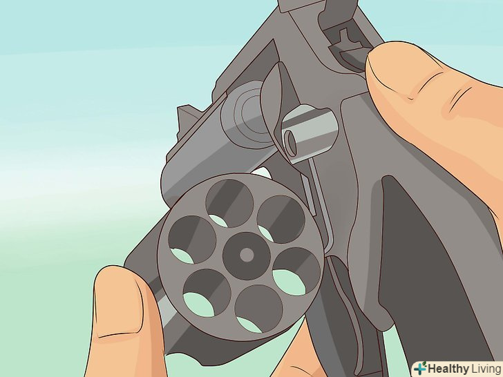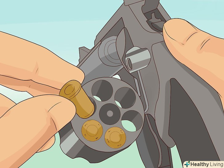 Зарядіть револьвер. у більшості револьверів в барабані 5 або 6 камор. Покладіть в кожну по патрону.- У револьверах з дверцятами тільки через неї з'являється доступ в одну з камор за раз, тому вам доведеться обертати барабан, щоб повністю його заповнити. [11] для даного типу револьвера одинарного пострілу найбезпечніший метод заряджання – це заряджання всіх камор по одній і відведення курка при незарядженої Камор до готовності зробити постріл. [12]