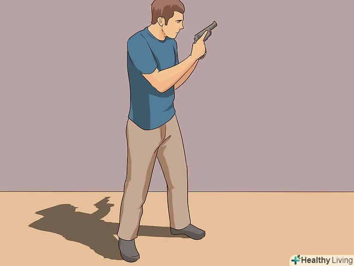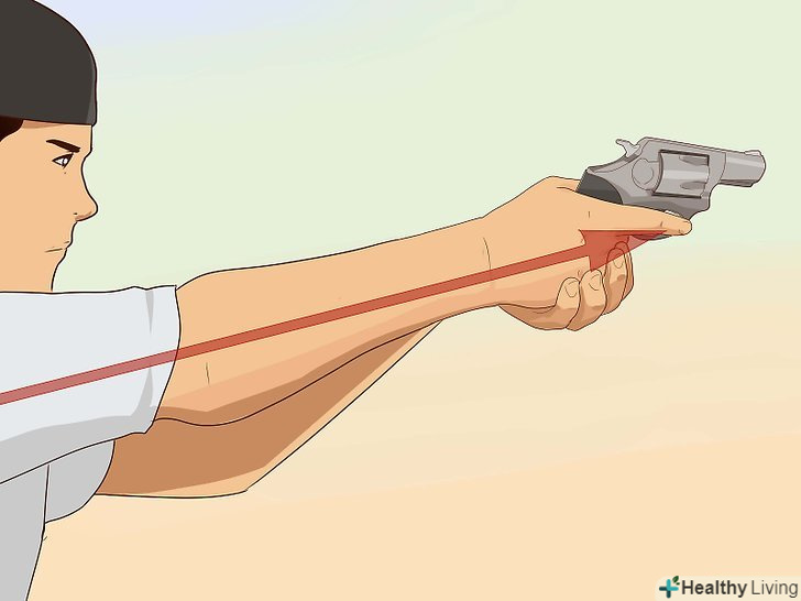 Випряміть руки в ліктях. на цьому етапі ви можете навести револьвер на мішень, а не в іншу сторону. Не змикайте лікті, але вирівняйте і випряміть їх, щоб тримати револьвер перед собою. Ідеальним розташуванням вважається рівень очей по прямій лінії. [17] це дозволить легко прицілитися, не повертаючи голову або шию.