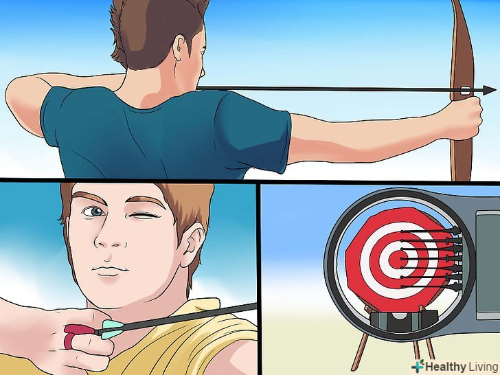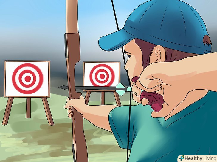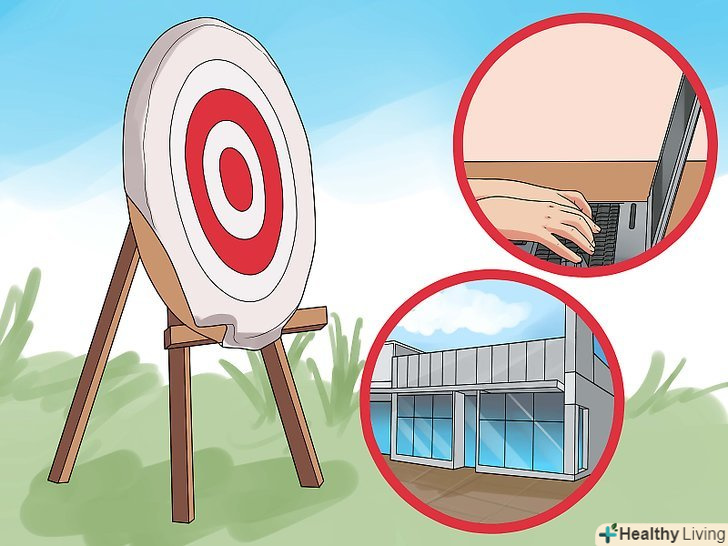 Знайдіть ціль для стрільби. стріляти з лука – це не так просто, як здається. Якщо ви плануєте стріляти на своєму задньому дворі, пристосованим під спеціальний корт, вам потрібно придбати спеціальні цілі, щоб не зламати стріли.- В якості альтернативи можна зробити цілі самостійно з двох щільних тюків сіна. Оберніть їх у тканину, щоб стягнути. [6]