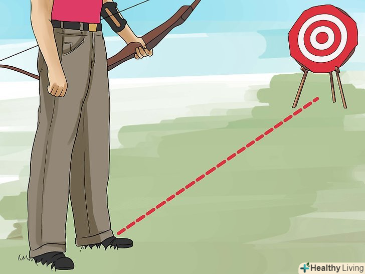 Орієнтуйтеся на лінію стрільби. лінія стрільби – це певна дистанція до мети. Встаньте прямо, поставивши ноги на ширині плечей і розташувавшись по центру лінії стрільби. [10]- Ноги на ширині плечей зроблять вашу позицію більш стійкою під час пострілу.