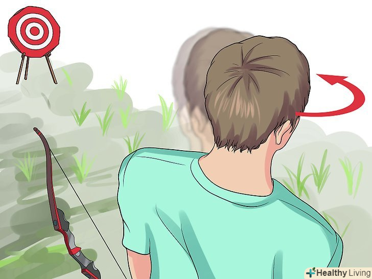 Поверніть голову у напрямку до мети. дивіться прямо на ціль. Повертаючи голову, не поверніть інше тіло слідом за нею – воно повинно бути перпендикулярно цілі. Слідкуйте за тим, щоб ваші плечі не піднімалися, а спина не горбилася. [11]