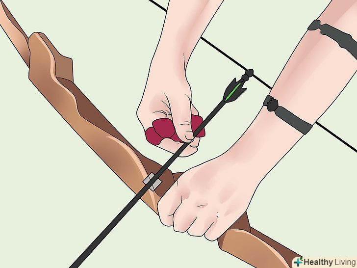Зарядіть стрілу в лук. для цього потрібно покласти її в спеціальну виїмку, а кінець приладнати до тятиви. Зробіть це до того, як ви піднімете цибулю.