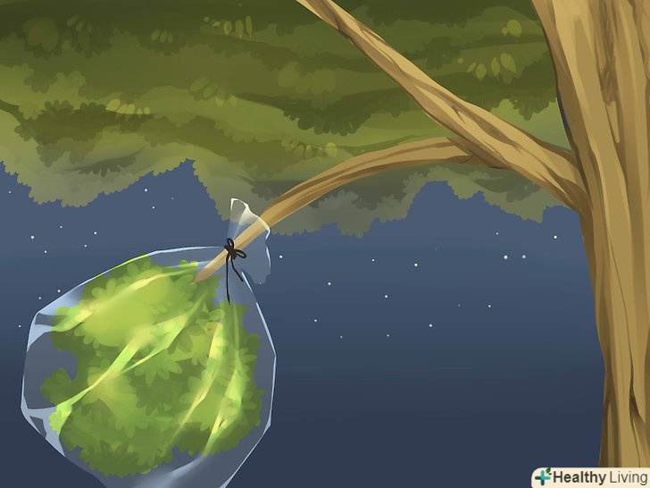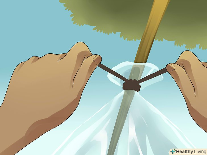 Використовуйте паракорд (або подібний матеріал), щоб прив'язати чистий пластиковий пакет на кінець гілки дерева. краватка прозорий пластиковий мішок на кінці рослини або невеликій гілці дерева. Не використовуйте скотч, так як тепло не дасть йому надійно приклеїтися до пакету.