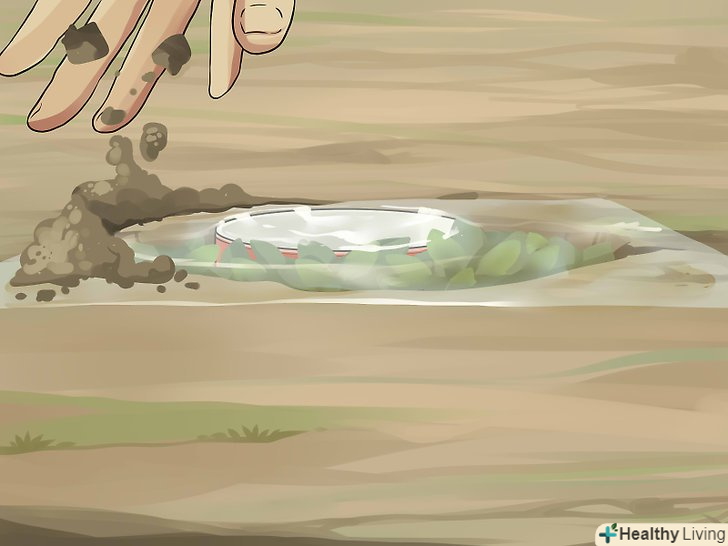 Закріпіть плівку, насипавши пісок по краях.- Насипте пісок з відступом від 2,5 до 5 см від краю плівки. Переконайтеся, що немає ніяких пропусків. Харчова плівка повинна» запечатати " ямку; якщо вона проколота, вода не буде конденсуватися.