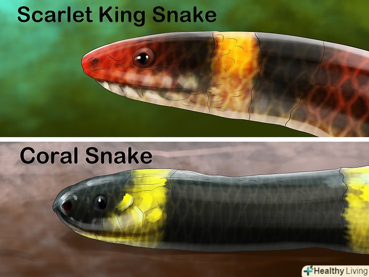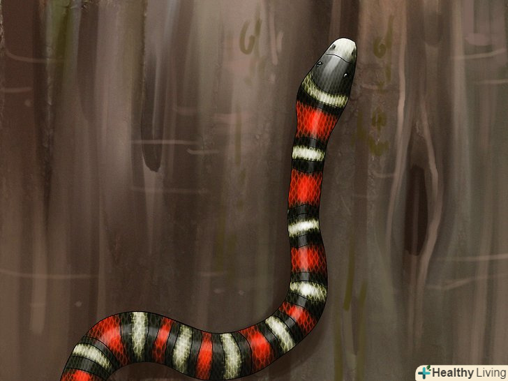 Огляньте кільцевої візерунок змії. ви повинні визначити, чи стикаються червоні і жовті кільця, якщо так, тоді це отруйний кораловий аспід. [1] проста перевірка візерунка – найлегший спосіб відрізнити отруйного коралового аспіду від поперечно-смугастої королівської змії.- У коралового аспіда кільця за кольорами розташовані в такому порядку: червоний, жовтий, чорний, жовтий, червоний.
