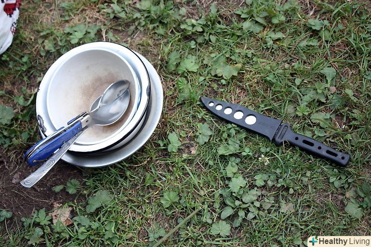 - Кухонне приладдя: беріть те, що дійсно потрібно. Одну невелику похідну плитку( і паливо), один або два горщики, пару щипців і кілька мисок, столові приналежності (столовий набір), тарілки, гострий ніж і обробну дошку, а також кілька чашок для напоїв. Фольга прекрасно підійде для багатьох потреб, і хоча скатертина дуже зручна для користування, ви також можете використовувати газету, якщо вона попадеться під руку. Також візьміть трохи миючого засобу (не небезпечного для навколишнього середовища) і кухонний рушник. Якщо у вас є бляшані банки, візьміть з собою консервний ніж (вони також можуть бути прикріплені до кишенькових ножів) і відкривачку – це буде дуже ДО РЕЧІ. Ви можете відмовитися від похідної плитки і просто готувати на вогні (не забудьте сірники), за умови, що ви вмієте розводити багаття. Також вам потрібно взяти сокиру або схожий інструмент для колки дров.