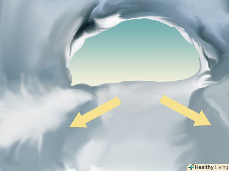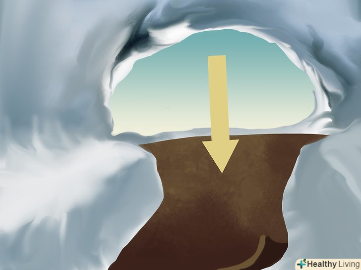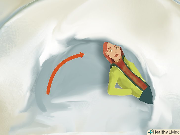 Сформуйте склепіння печери. Вигрібайте сніг з центру замету або снігового наносу назовні через вхідний тунель. Коли ви звільнили від снігу достатньо місця для вашого тіла, ви можете залишитися всередині печери і виштовхувати сніг назовні ногами. [13] переконайтеся, що стеля не тонше 30 сантиметрів, щоб мінімізувати шанс обвалення. [14] стіни повинні бути на 10 або більше сантиметрів товщі, ніж стеля. [15]- Постарайтеся зробити рівень підлоги печери вище, ніж у вхідному тунелі. Таке рішення допоможе зберегти тепло в спальній зоні, оскільки холодне повітря буде накопичуватися біля входу в тунель.