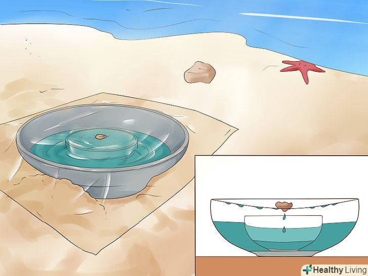 Поставте миску під прямі сонячні промені. в результаті вода розігріється, почне випаровуватися і конденсуватися на плівці. Прісні краплі конденсату будуть стікати по плівці в чашку. [5]- Це дозволить вам повільно зібрати прісну воду.