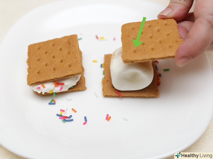 - Притисніть пастилку другим крекером зверху. В результаті шоколад наполовину розплавиться, і між крекерами утворюється смачна суміш маршмеллоу і шоколаду.