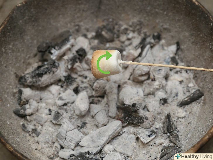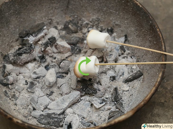 Поступово повертайте шампур. обертайте шампур так, щоб пастилка рівномірно підсмажилася з усіх боків. Її поверхня повинна стати коричневою. Можна постійно обертати шампур, до тих пір поки маршмеллоу не придбає красивий золотисто-коричневий відтінок, або спочатку як слід підсмажте одну сторону, а потім поверніть шампур і виконайте те ж саме з другою половиною.- Буває, що пастилка висить занадто вільно і не повертається при обертанні шампура. В такому випадку притримайте її або проткніть другим шампуром.