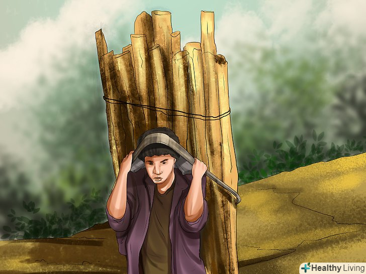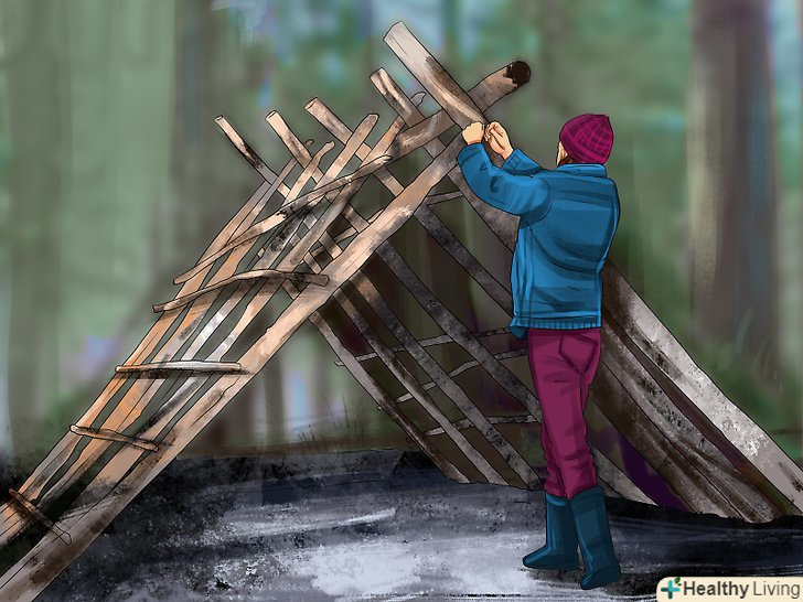Побудуйте укриття. найпростіше притулити що-небудь до дерева або каменю, хоча таке укриття не прослужить довго. На перший тиждень або два побудуйте просту конструкцію, під якою ви могли б спати. Живіть в ній, поки будете будувати щось більш надійне. Чим довше ви розраховуєте прожити в новому будинку, тим якіснішим має бути це житло.- Не рекомендується спати на землі. Застилайте підлогу житла гілками болиголова, листям і сіном. Якщо цього не зробити, ви замерзнете вночі.
