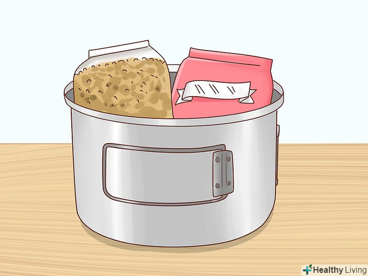 Правильно упакуйте спеціальні контейнери. це щільні контейнери, в яких зберігають продукти харчування, дезодоранти, сонцезахисні креми та інші предмети, які можуть залучити ведмедів. Ці контейнери необхідні, якщо ви відправляєтеся в похід в місцевість, де водяться ведмеді. Якщо ви збираєтеся в похід саме в таку місцевість, важливо правильно упакувати такий контейнер, щоб він не заважав в рюкзаку.- Не варто намагатися заповнити порожнечі в такому спеціальному контейнері одягом. Можна використовувати дощовик або пакувальні пакети, щоб заповнити зайвий простір. Але не варто класти туди все, чим ви збираєтеся користуватися в поході. Ви ж не хочете, щоб ведмедя залучив до вашої наметі запах одягу, яку ви наділи після того, як вона просочилася запахом їжі.