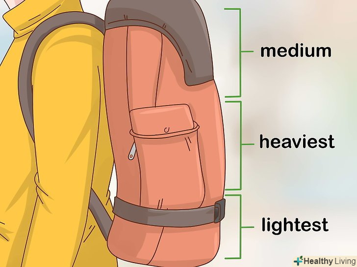 Найлегші предмети потрібно укласти зверху, а найважчі — вниз біля спини. постарайтеся розподілити вагу таким чином, щоб найлегші предмети виявилися зверху, а важкі — в центрі між лопатками. Середні предмети повинні бути складені навколо них-це найкращий спосіб зберегти здорову спину під час походу. Якщо спочатку ви упакуєте важкі предмети, навантаження на спину буде більше. Розклавши важкі предмети в рюкзаку вздовж верхнього відділу хребта, ви зосередите вагу на стегнах, а не в тому місці, де це може привести до травми. [3]- Якщо ви збираєтеся ночувати в наметовому містечку, спочатку упакуйте свій спальний мішок і інші предмети, пов'язані з легким сном. Також покладіть зверху змінний одяг, запасні шкарпетки, рукавички і так далі.