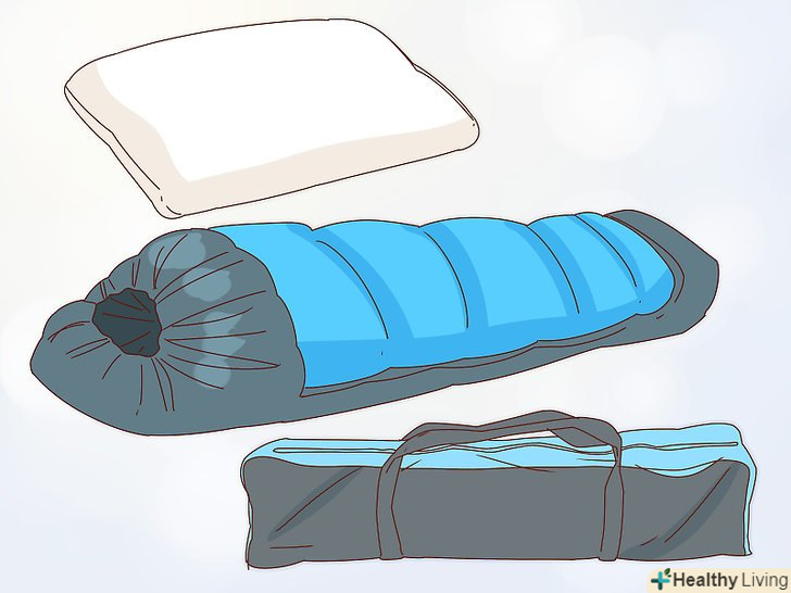 Візьміть намет, спальні мішки та інші речі, необхідні для сну. для намету необхідні сама намет, стійки, кілочки і щось, чим ви будете забивати кілочки в землю. Кожному туристу знадобиться спальний мішок і туристичний килимок для ізоляції від холодної землі. Залежно від погоди, може стати в нагоді додаткове ковдру. Якщо у вашому спальному мішку немає вбудованої подушки, візьміть з собою окрему подушку для додаткової зручності. [13]- Багато наметів укомплектовані тентом для захисту від дощу. Якщо у вашої намети його Немає, Візьміть окремий тент на випадок дощової погоди.