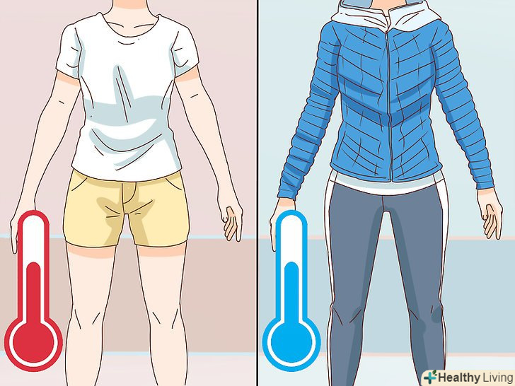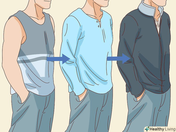 ОдягайтеКілька шарів одягу , які можна знімати вдень і надягати ввечері. наприклад, в прохолодну погоду надіньте майку, на неї — сорочку з довгими рукавами, а зверху — спортивний светр. Ви зможете знімати і надягати шари за потребою. Під штани добре надіти Кальсони, які забезпечать додатковий шар тепла. [18]- Одяг з вбирає вологу тканини найбільш зручна, так як вона дозволить вашій шкірі залишатися прохолодною і сухою, навіть якщо ви спітнієте.