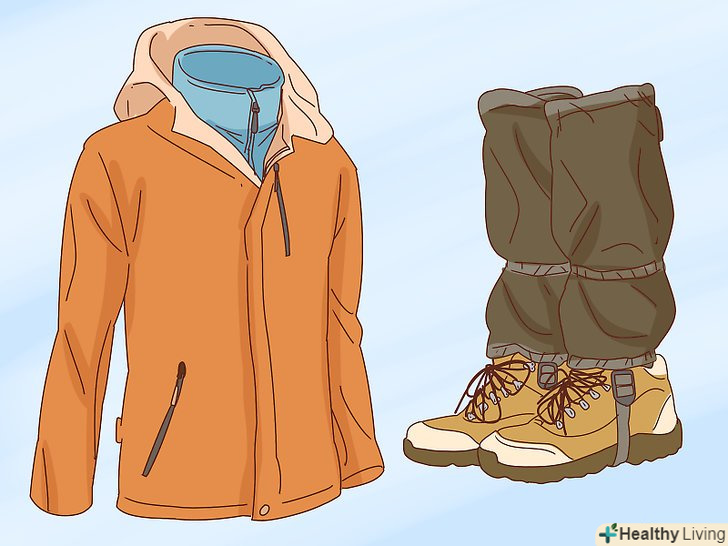 ВізьмітьНепромокальні куртку і черевики на випадок дощу. варто придбати дощовик з капюшоном — з ним ваша голова і волосся будуть завжди залишатися сухими, завдяки чому ви будете почувати себе більш комфортно. Не беріть одяг з ПВХ (вінілу). Хоча такий одяг не пропускає воду, вона також не пропускає повітря, і через це ви можете швидко перегрітися. [19]- Якщо ви не хочете витрачатися на непромокальні черевики, можна купити водовідштовхувальний спрей і нанести його на ту взуття, яка у вас є, щоб волога не просочувалася всередину.