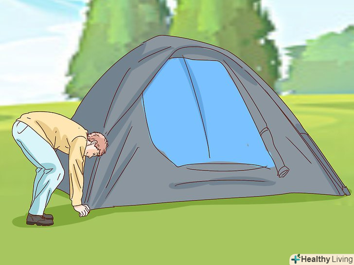 Поставте наметІ приготуйте спальні приналежності до настання темряви. виберіть місце для намету і місце для приготування їжі. Бажано, щоб відстань між місцем приготування їжі і наметом було побільше — це зменшить ймовірність того, що дикі тварини будуть копошитися біля вашого намету. Як тільки ви визначилися з місцем для намету, встановіть її відповідно до інструкції і розкладіть килимки, спальні мішки, ковдри та подушки. [22]- Якщо ви ніколи раніше не ставили намет, варто спробувати зробити це до походу. До більшості наметів додається докладна інструкція, а ставити їх не дуже складно, так що просто проявіть терпіння, і ви без зусиль зробите це!