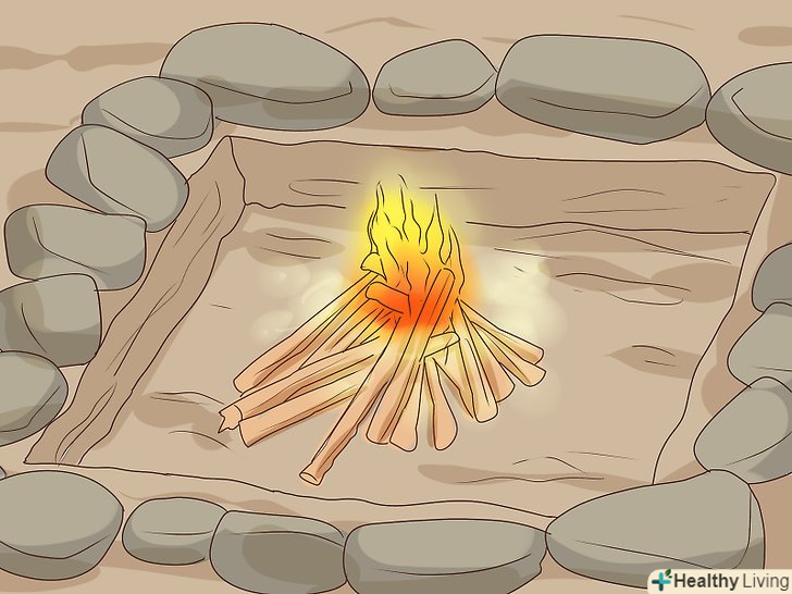 Розведіть багаттяВ безпечному і відповідному місці, коли ви будете готові до цього. у кемпінгу може бути спеціальне місце для розведення багать — кострище. Якщо ви в лісі, зробіть своє вогнище, яке повинно знаходиться як мінімум в 2,5 м від сухої трави та іншої рослинності. Викопайте в землі яму глибиною 8-10 см і з викопаної землі спорудити валик навколо цієї ями. Якщо навколо є камені, обкласти ними яму для додаткового захисту від вогню. [25]- Для багаття вам знадобляться труть, розпалювання і дрова. Труть-це щось маленьке і добре загоряється, наприклад шматочки картону, дрантя або берести. Розпалювання робиться з маленьких гілочок. Дрова можуть бути цілими або розколотими полінами, вони обов'язково повинні бути сухими.