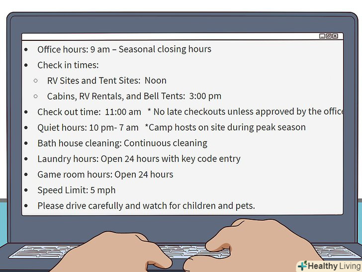 Подивіться в Інтернеті, яким правилам ви повинні будете слідувати. кожен кемпінг має свої правила: в деяких може бути заборонено вживання алкоголю або знаходження з домашніми тваринами, також можуть бути різні вимоги до зберігання продуктів і викидання сміття. У деяких місцях не дозволяється ставити намет раніше певного часу, а в день від'їзду потрібно покинути стоянку в певну годину. Перевірте ці правила заздалегідь, щоб бути готовими і не виявитися розчарованими. [4]- Пам'ятайте, що ці правила прийняті для того, щоб забезпечити безпеку і комфорт вас і інших відвідувачів кемпінгу.