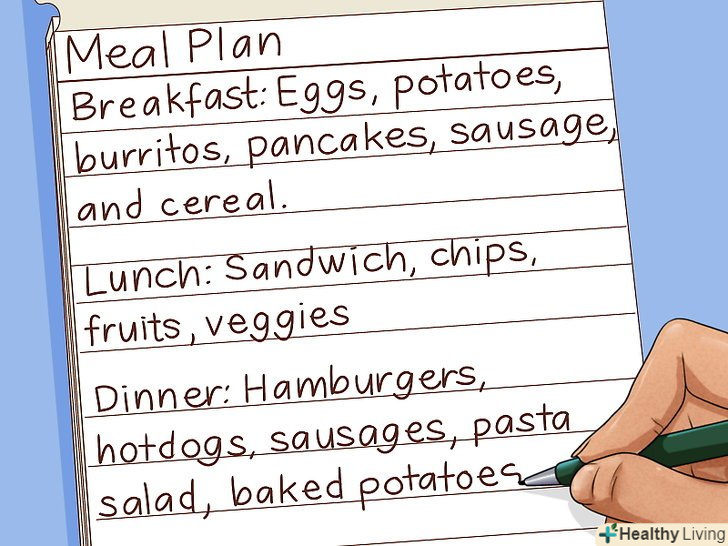 Складіть раціон харчування, щоб взяти рівно стільки продуктів, скільки необхідно. Задайте собі питання: скільки людина йде в похід і на скільки днів? Якщо ви збираєтеся жити в кемпінгу, чи є там обладнання для приготування їжі і яке? Якщо ні, на чому ви будете готувати? Якщо у вас є багаття і сковорода, ви можете приготувати досить багато страв: яєчню, смажену картоплю, гамбургери, сосиски. Але майте на увазі, що не у всіх кемпінгах дозволяється розводити багаття, особливо влітку в суху погоду. [6]- Якщо ви йдете в похід великою компанією, розподіліть відповідальність за прийоми їжі між різними людьми, так, щоб кожен відповідав за планування, покупку і приготування їжі на один-два прийоми їжі.