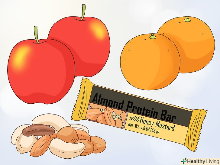 Віддайте перевагу висококалорійної їжі, якщо виЙдете в похід в ліс. якщо ви збираєтеся провести багато часу в пішому маршруті, де у вас не буде сумок-холодильників, повних їжі, ви навряд чи захочете перевантажувати свій рюкзак банками, сирим м'ясом і тоннами свіжих фруктів. Замість цього зупиніться на сублімованому м'ясі, яке вбирає воду при нагріванні. Візьміть перекушування на час, наприклад, горіхи і протеїнові батончики. Арахісове масло і шоколад — також чудові висококалорійні продукти, які швидко дадуть вам сили, коли вони будуть потрібні. [7]- Не варто зовсім відмовлятися від свіжих продуктів на час походу. Візьміть трохи фруктів, наприклад яблук або апельсинів, - їх можна їсти на ходу.