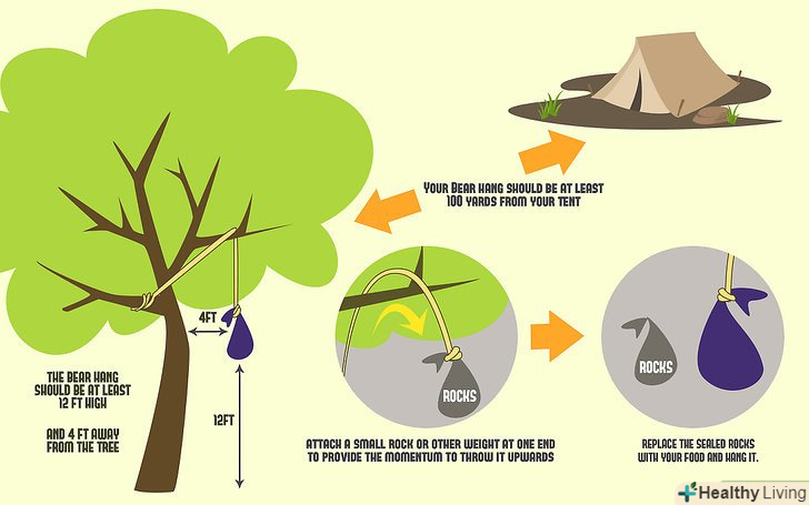 Зробіть ведмежу підвіску. якщо у вас немає доступу до будь – якого притулку або контейнеру, у багатьох випадках найкращий варіант-ведмежа Підвіска, хоча треба знати, що в багатьох парках ставлення змінилося на користь каністри, захищеної від ведмедів, тому що в багатьох місцях ведмеді придумали прийом від ведмежої підвіски. Якщо можна як і раніше використовувати ведмежу підвіску там, де ви ходите в походи, ви можете зробити її таким чином:- Виберіть відповідне місце між двома деревами, хоча б в 90 метрах від намету. Не вішайте її на ягідних ділянках, очевидних ведмежих стежках і т. д.
