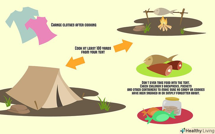 - Ніколи не приймайте їжу в наметі. Це дуже важливо, тому що у ведмедя може виникнути спокуса розірвати намет, щоб дістатися до корму. Перевірте Дитячі рюкзаки, кишені та інші контейнери, щоб переконатися, що цукерки або печиво не були таємно заховані або просто забуті. Дуже легко не помітити сильно пахнуть льодяники, жувальну гумку і цукерки, не знаючи про них.