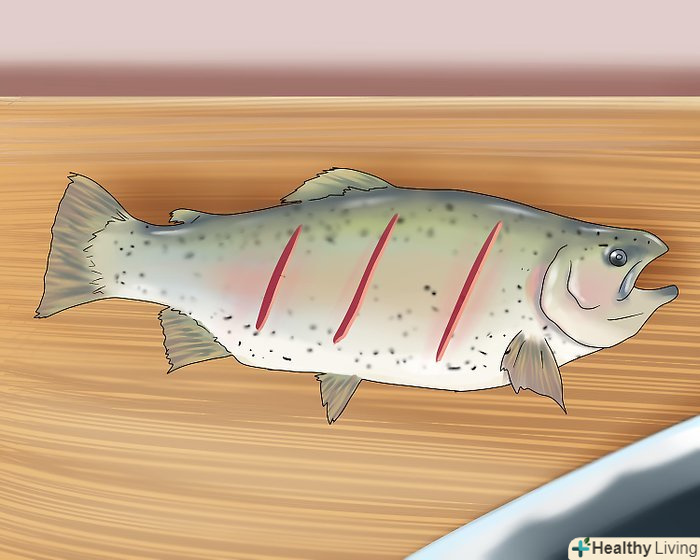 Зробіть три надрізи з боків риби і покладіть в них спеції і трави, а також лимон. якщо готуєте цілу рибу зробіть більше глибоких надрізів по обидва боки. Це дуже важливо, через ці надрізи смак лимона і спецій перейде до м'яса риби.- У випадку з філе просто замаринуйте його в соусі.