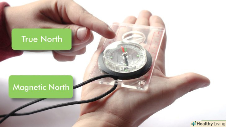 - Зорієнтуйте стрілку напрямку компаса на першому об'єкті. якщо тільки цей об'єкт не на півночі, магнітна стрілка обов'язково відхилиться в сторону. Обертайте шкалу поділок, поки стрілка напрямку не співпаде з магнітною стрілкою, що вказує на північ. Як тільки вони співпадуть, ви побачите, на якій позначці знаходиться лінія напрямку, що вказує на об'єкт. Виключіть місцеві магнітні варіації, підкрутивши шкалу поділок.
