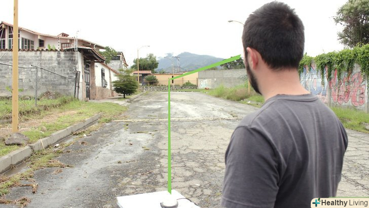 - Ви можете тримати компас в умовному квадраті, затиснувши його межу двома великими пальцями (пальці будуть показувати L) і розставивши лікті в різні боки. Станьте обличчям до об'єкта, на який ви орієнтуєтеся, дивіться прямо і проведіть лінію межу вами і об'єктом, на який ви орієнтуєтеся. Уявна лінія повинна виходити від вас і проходити через лінію напрямку компаса. Ви навіть можете прибрати пальці і уперти компас в живіт, щоб надійніше тримати компас. Єдине, переконайтеся, що на вас немає ременя з металевою бляхою або інших металевих предметів, які можуть відхилити магнітну стрілку.