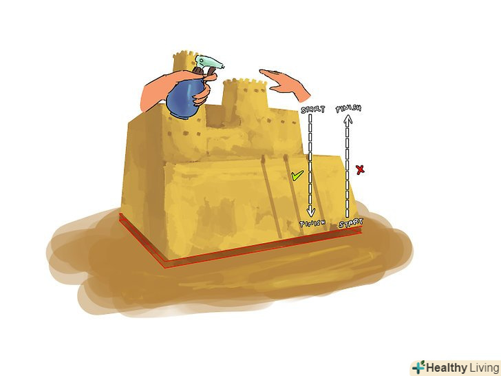 Видаліть зайве. після того, як ви насипали пісок пірамідою потрібного розміру, почніть видаляти зайве і наносити ті деталі, які повинні бути на вашому замку. Якщо ви хочете замок зі шпилями і тому подібним, то зараз якраз час їх додати. Починати роботу слід обов'язково зверху, так ви не зможете пошкодити нижні елементи. Працюючи з піском, не забудьте час від часу збризкувати його водою, інакше він пересохне і не буде ліпитися. Переконайтеся, що ви зробили все, що хотіли, вгорі, перш ніж перейти на нижні рівні майбутнього замку.