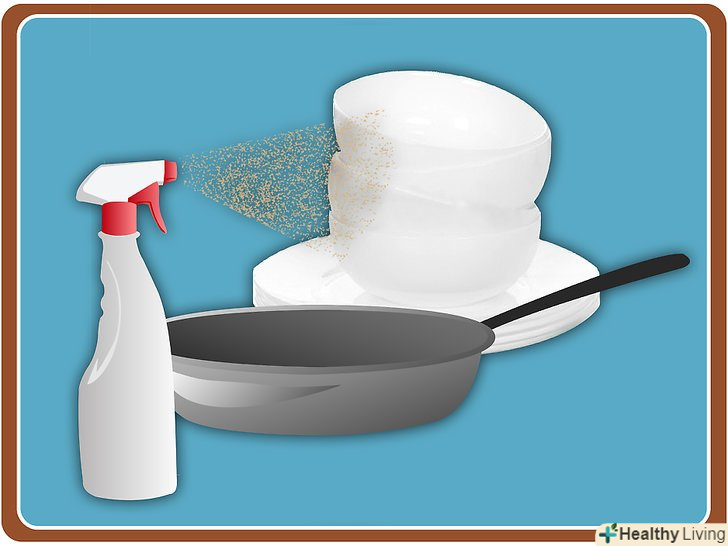 Нанесіть спрей для миття вікон або будь-який інший побутовий спрей на котли (досить буде невеликої кількості) і залиште його на поверхнях, поки ви їсте. після їжі побризкайте спреєм на тарілки.