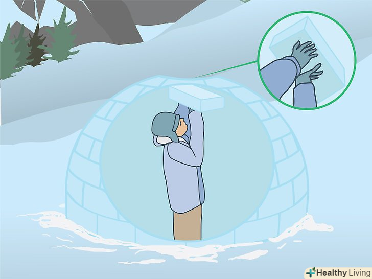 Акуратно прилаштуйте самі верхні блоки. їх важче приладнати до сусідніх блоків, так що не поспішайте і будьте обережні, підганяючи ці блоки, — від них багато в чому залежить міцність всієї споруди. За допомогою снігового ножа або мачете добийтеся, щоб вони щільно прилягали один до одного.- В самому кінці у вас залишиться зверху маленький отвір. Візьміть останній блок і просуньте його вузьким торцем в цей отвір.
