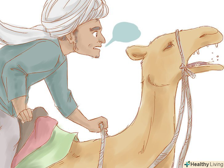 Не кричіть на верблюда і не бийте його. Крики тільки погіршать справу. Так що спробуйте сказати йому що-небудь ласкавим, заспокійливим голосом. Навіть не намагайтеся вдарити тварину! Ви тільки ще більше злякаєте його. Щоб верблюд довіряв вам, він повинен вважати вас своїм другом, а не ворогом.- Заздалегідь розучіть спеціальні команди, які потрібно давати верблюдові під час поїздки. У кожного господаря тварини можуть бути свої команди. Тому заздалегідь дізнайтеся, що потрібно говорити верблюдові, щоб заспокоїти його.
