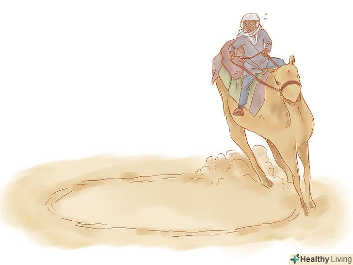 Постарайтеся змусити верблюда рухатися по колу. Якщо поводи приєднані до вузді, яку часто надягають на верблюдів, які возять туристів, то ви можете обережно потягнути за поводи і змусити тварину бігати по колу. Це заспокоїть і сповільнить його. Але нехай він біжить в ту сторону, яку вибере сам. Потягніть за поводи в ту сторону, куди він повертає голову. Якщо верблюд вирішить повернути в іншу сторону, то дайте йому це зробити, а потім Натягуйте поводи.- Тільки не натягуйте поводи занадто сильно. Інакше ви пораните верблюда, якщо поводи прикріплені до кілочка в носі.