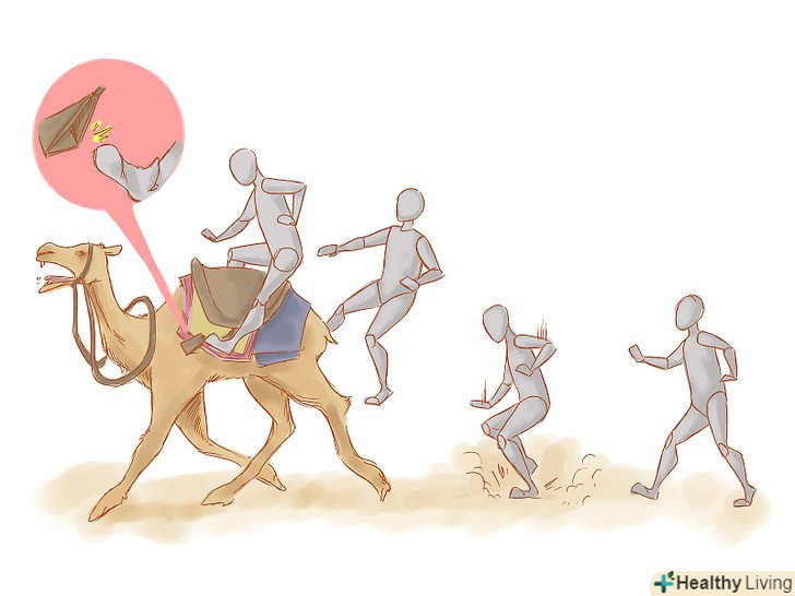 Зачекайте, поки верблюд не зупиниться. Ваша мета – утриматися на ньому. Вожміться в сідло і міцніше затисніть верблюда ногами. Руками тримайтеся за ріг на сідлі. Якщо сідла під вами немає, то нахиліться трохи назад і тримайтеся за що знайдете. Намагайтеся не сидіти прямо на горбі.
