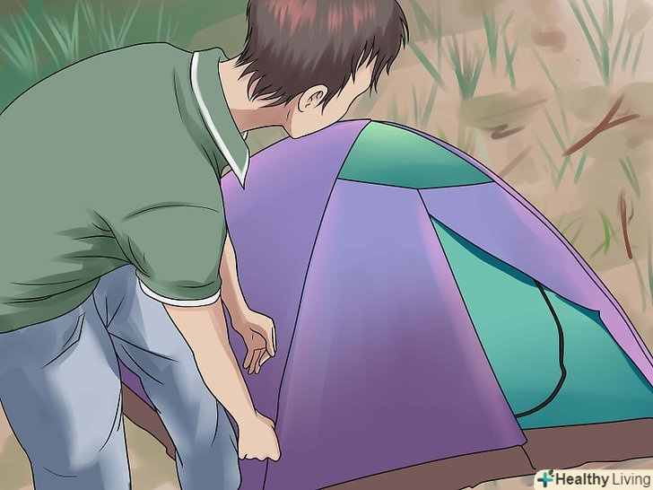 - Після того як ви поставили намет, покладіть куточки брезенту під тент, щоб переконатися, що нічого не залишилося зовні. Якщо зовні залишиться хоч невеликий шматочок, це може загрожувати попаданню води в намет знизу під час дощу.