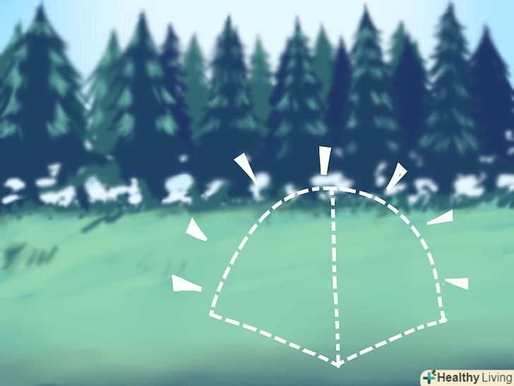 Шукайте місце, де можна сховатися від сонця і тіні. в ідеалі, намет повинна бути розміщена таким чином, щоб залишатися в тіні протягом усього наступного ранку, особливо, якщо жарко. І хоча купольні намети стійкі по відношенню до вітру, також добре знайти місце, приховане від вітру, на випадок, якщо ви будете перебувати далеко від намету. Останнє, що ви хотіли б, це повернутися в порожній кемпінг! Розмістити намет на західному схилі пагорба буде найкращим способом комфортно провести всередині ніч і прохолодний ранок.- Ніколи не ставте намет під деревами. У разі дощу заманливо думати, що крона дерева буде безпечною альтернативою парасольки. На жаль, тут є ризик блискавки та інших небезпек. Намет не зупинить падіння дерева, якщо щось трапиться. Краще перебувати подалі від такої небезпеки.