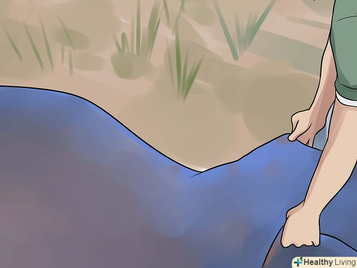 Знизу покладіть непромокальний брезент. у той час як більшість наметів продається без нього, купити його необхідно, так як пластиковий або вінілової брезент забезпечує захист від вологи між наметом і землею. У той час як немає необхідності використовувати брезент, щоб уберегти намет від протікання знизу, якщо йде дощ, ви будете щасливі від того, що він у вас є. [1]- Складіть брезент в залежності від форми намету, але за розміром він повинен бути трохи менше намету. Якщо є ризик дощу, у вас не повинно бути жодного відкритого кута. Не турбуйтеся про те, щоб укласти брезент ідеально, тому що Ви зможете це зробити після того, як поставите намет.