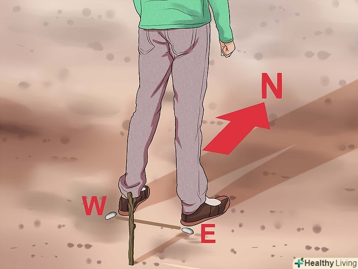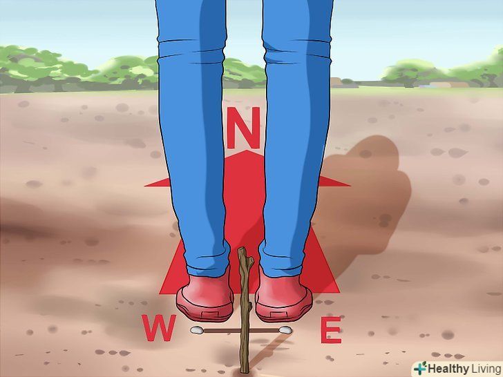 Встаньте так, щоб перша відмітка (захід) була зліва від вас, а друга (Схід) — справа. ви будете дивитися на північ, причому незалежно від того, де перебуваєте. В основі цього методу лежить той факт, що сонце рухається по небосхилу зі сходу на захід.