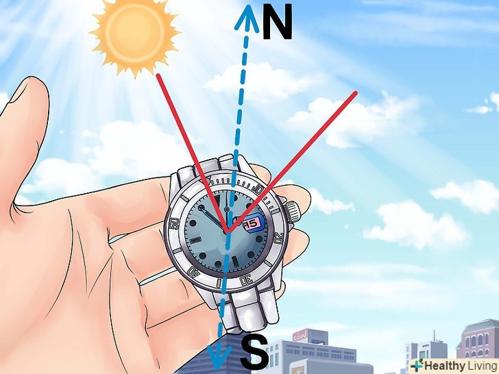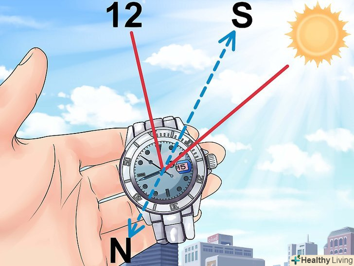 Проведіть бісектрису кута між годинниковою стрілкою і позначкою 12 на циферблаті годинника. бісектриса, тобто лінія, що ділить кут навпіл, буде лінією північ — південь. Якщо не знаєте, де саме південь, а де північ, пам'ятайте, що сонце завжди встає на Сході і заходить на заході. У Північній півкулі Сонце опівдні дивиться на південь. Якщо ваш годинник переведені на літній час, діліть навпіл кут між годинниковою стрілкою і цифрою 1.