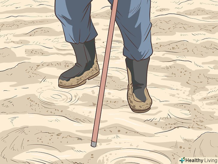 Перевіряйте землю перед собою за допомогою своєї тростини. завжди ходіть з масивною тростиною, щоб використовувати її як в тому випадку, якщо ви застрягнете в хиткому піску, так і для того, щоб перевіряти землю перед собою. Кілька секунд, які ви витратите на зондування грунту тростиною, може врятувати вас від важкої боротьби з озером хиткого піску і забезпечити безпечну прогулянку.
