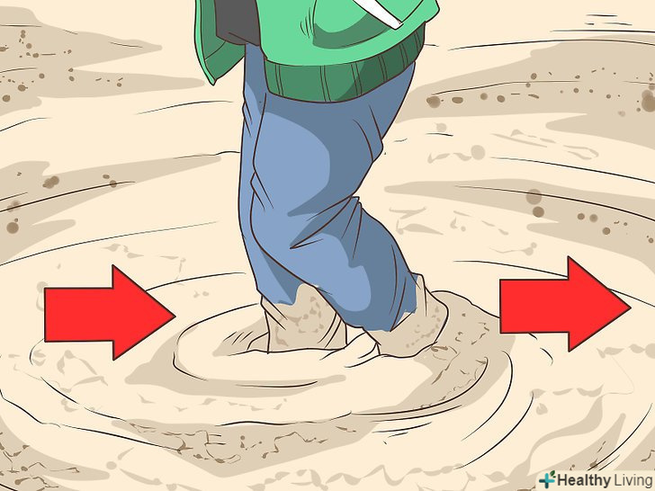 Рухайтеся в горизонтальному напрямку. Якщо ви відчуваєте, що застрягли, зробіть пару швидких кроків назад до того, як хиткий пісок знерухомить вас. На те, щоб суміш стала текучої зазвичай йде кілька хвилин, тому кращий спосіб вибратися – це не пов'язати в піску взагалі.- Якщо ваші ступні все таки загрузли, не робіть великих і різких кроків в спробах вивільнитися. Зробивши великий крок вперед, ви зможете вивільнити одну ступню, але при цьому друга ваша ступня зануриться ще глибше, і повне вивільнення стане надзвичайно скрутним.