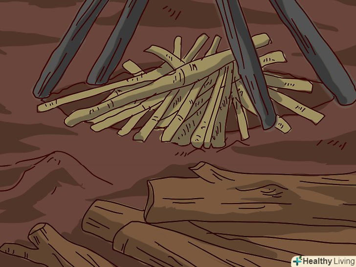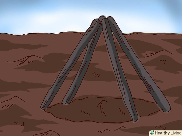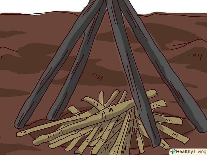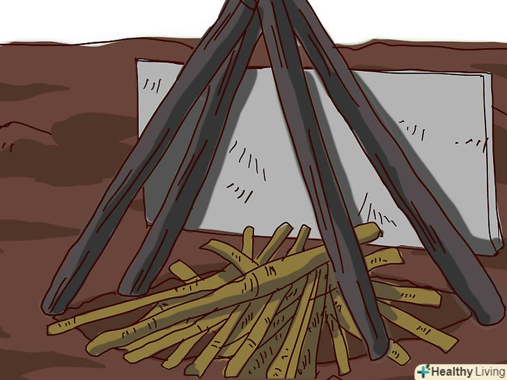 Почніть з пошуку досить довгих палиць середньої товщини, які будуть служити для підтримки багаття, щоб поставити їх в середину простору, навпроти якого будуть класти всі палиці.
