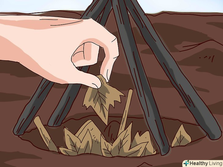 Зберіть маленькі сухі гілки і шматки кори дерев. пошук дрібних і сухих гілок може бути довгим, так що наберіться терпіння і виділіть на цей час, якщо тільки поруч з вами немає спеціально заготовлених гілок, складених в одному місці. Кладіть їх біля багаття. Коли зберете достатньо, акуратно покладіть їх навпроти підтримують палиць, в середину місця для вогню.