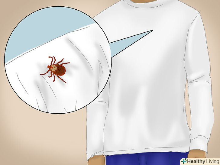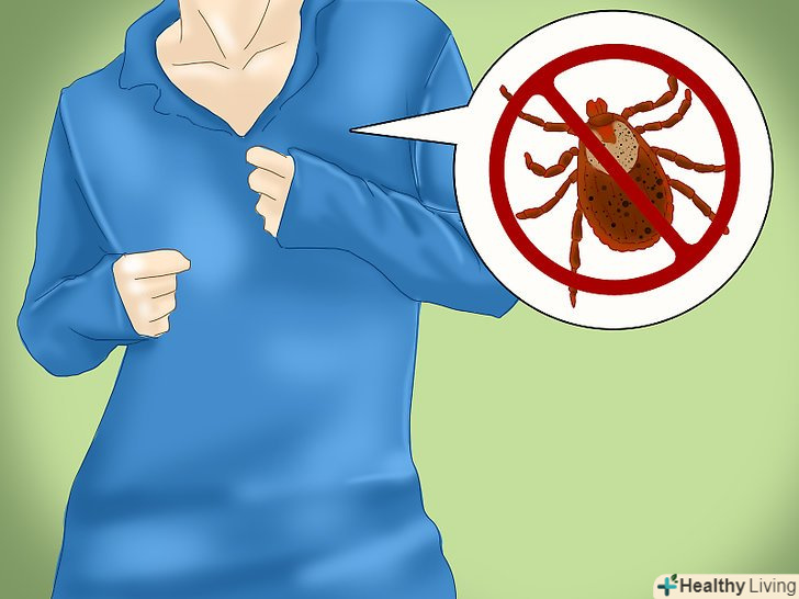 Одягніть сорочку з довгими рукавами і штани. хоча кліщі можуть запросто заповзти під одяг, зменшіть ризик підчепити кліща, закривши більше шкіри і тим самим ускладнивши йому завдання. [9]- Заправте сорочку в штани, а штани - в шкарпетки, щоб не дати кліщам проникнути під одяг.