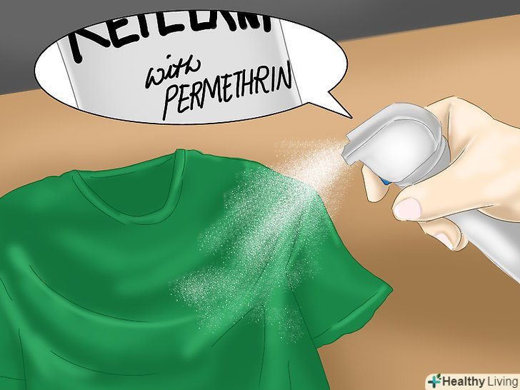 Обробіть одяг та інші тканини засобом, що містить перметрин. Перметрин виявився досить ефективним засобом проти кліщів, але його не слід наносити безпосередньо на шкіру. Замість цього засіб наноситься на одяг, забезпечуючи захист навіть після декількох прань. [20]- Репеленти з перметрином можна знайти в магазині спортивних товарів, туристичного спорядження та в Інтернеті.