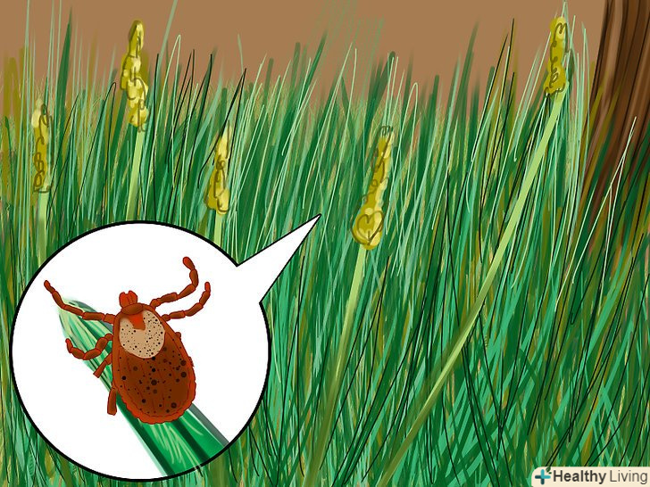 Тримайтеся подалі від високої трави. намагайтеся уникати районів з високою травою або чагарником, тому як на них зазвичай і сидять Кліщі В очікуванні жертви (тварини або людини), яка пройде повз трави або зачепить її, що дозволить кліщам зачепитися. [4] [5]- Кліщі тримаються за траву задніми ногами, виставивши передні перед собою, намагаючись вхопитися за свого майбутнього носія.