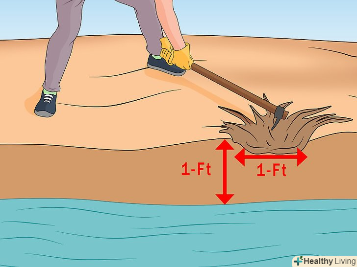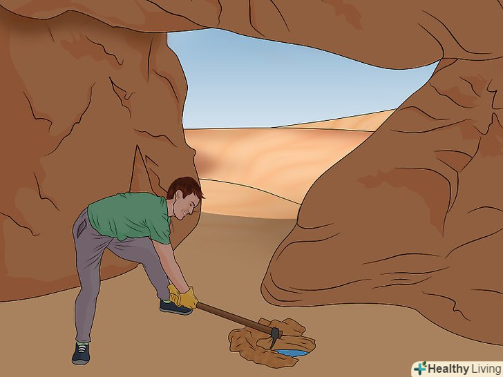 Спробуйте дістатися до підземних вод. коли ви знайдете один з перерахованих вище об'єктів, виройте в грунті ямку глибиною близько 30 сантиметрів. Якщо ви відчуваєте, що грунт вологий, розширте поглиблення приблизно до 30 сантиметрів в діаметрі. Зачекайте кілька годин, поки ямка наповниться водою. [9]- Завжди намагайтеся очищати знайдену воду . Однак якщо у вас немає іншого вибору, пийте неочищену воду. Навіть якщо ви захворієте, симптоми проявляться через кілька днів, в той час як зневоднення позначиться значно раніше.